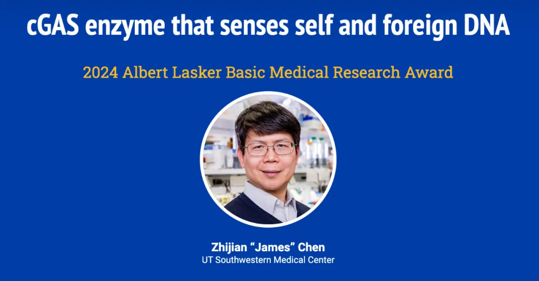 在2024年度奖项评选中,得克萨斯大学西南医学中心的陈志坚(Zhijian Chen)博士被授予了拉斯克基础医学研究奖,以表彰他在发现环鸟苷酸-腺苷酸合成酶(cGAS)-STING信号通路中的贡献。