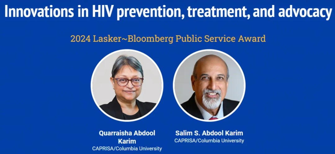 公共服务奖授予了CAPRISA研究中心/哥伦比亚大学的Quarraisha Abdool Karim博士与Salim Abdool Karim博士,以表彰他们阐明了异性恋HIV传播的主要驱动因素,并引入了预防和治疗HIV的方法。
